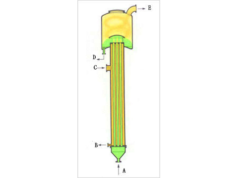 這種蒸發(fā)器的特征是具有長(zhǎng)的加熱管(約為5~7M),但加熱室和沸騰室之間的溫度差也要大,否則,蒸汽流的能量不足于輸送液體和產(chǎn)生爬升的膜。